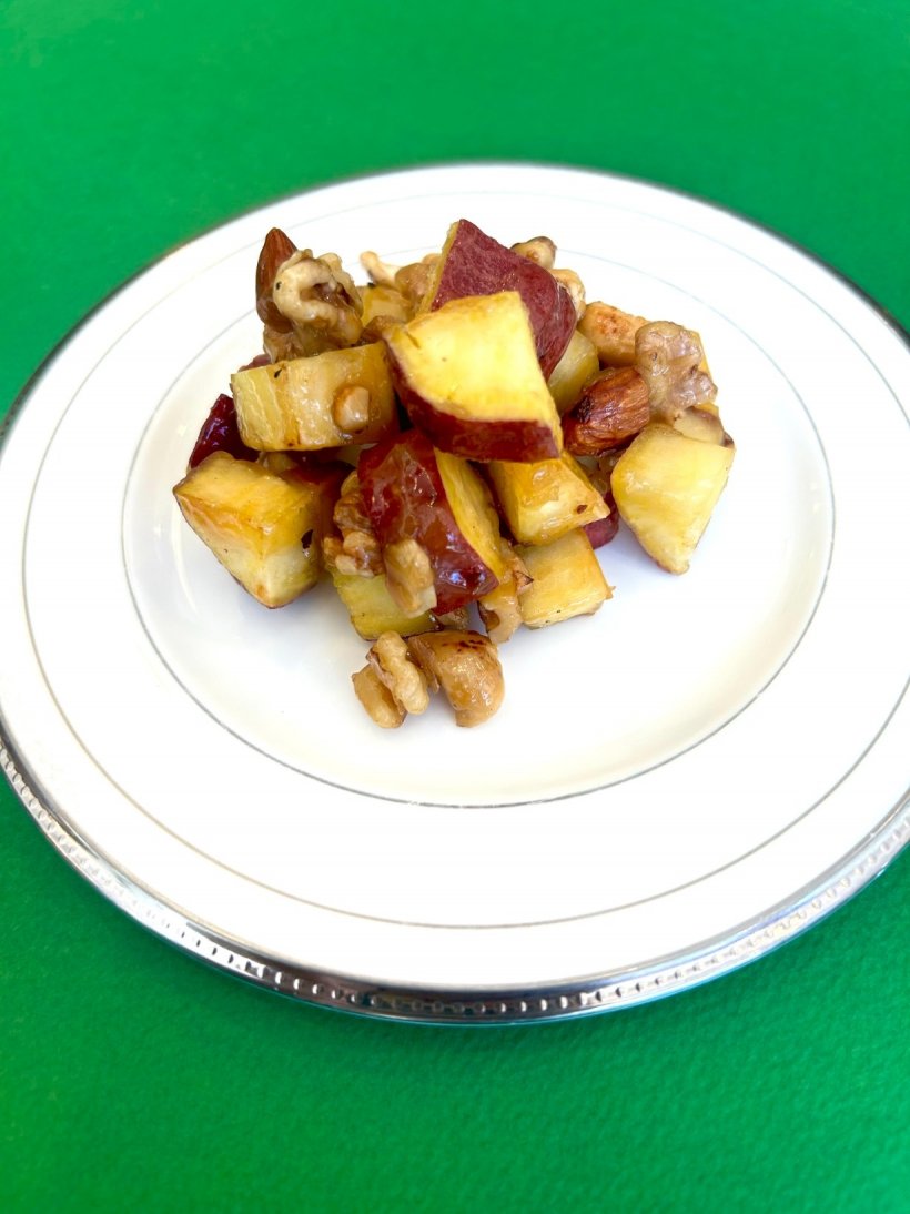 - 別のフライパンにAを入れ黄金色になるまで熱し、黄金色になったらナッツとサツマイモを入れる。