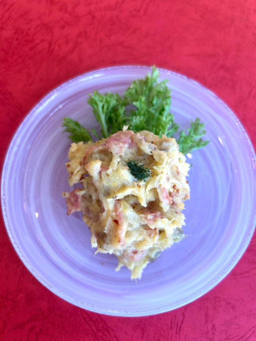 - 焼き芋は皮をむいて上下を切り落としフォーク等でつぶす。
