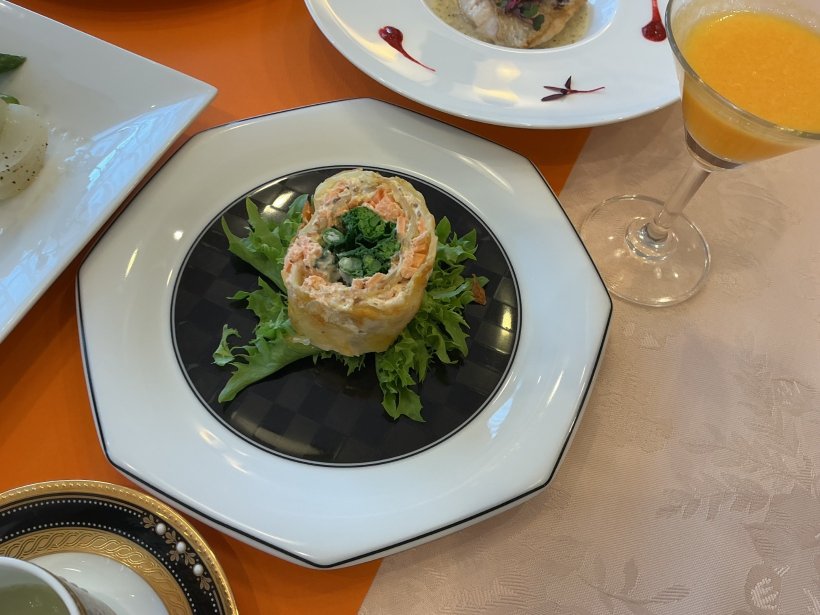 一品はヨーグルトと焼き鮭のソースをじゃがいもガレットで巻いております。