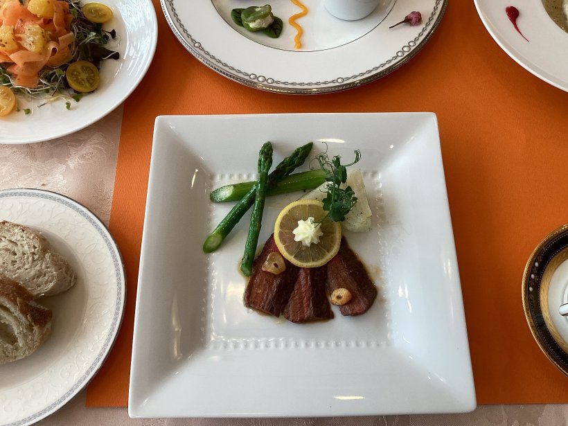 メイン料理は牛ステーキで、ガーリックレモンソースでさっぱりしたソースで仕上げました。