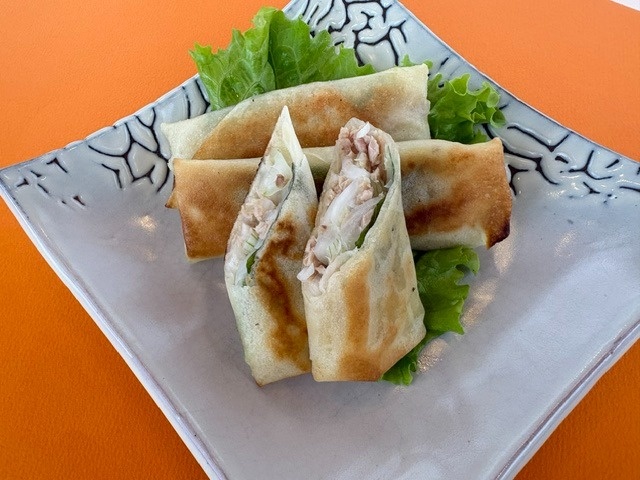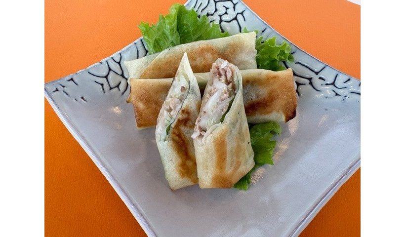 - 春巻きの皮に大葉、和えた新玉ねぎをのせ包む。巻き終わりに水で溶いた薄力粉を少量つけ空気が入らないようピッタリ巻く。